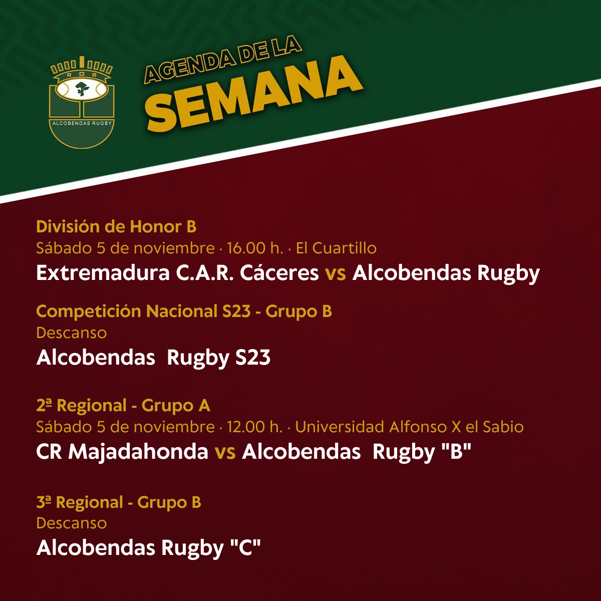 Por su parte, Alcobendas Rugby «B» volverá a la competición tras semanas de descanso y lo hará el sábado a las 12.00 h. en la Universidad Alfonso X El Sabio contra Club Rugby Majadahonda. El encuentro que tenía lugar este fin de semana Alcobendas Rugby «C» frente a CRC Pozuelo «C» será aplazado para enero de 2023.