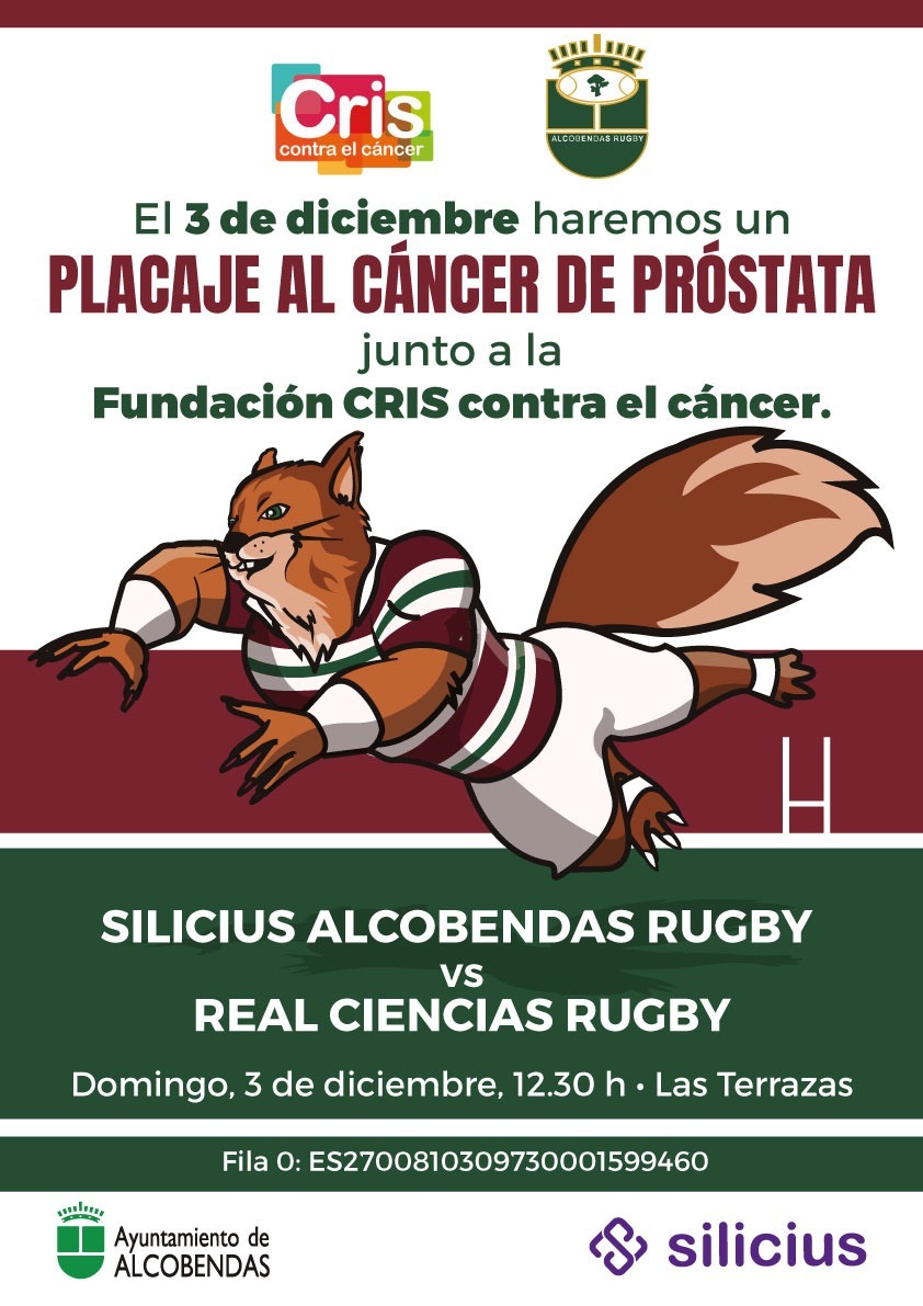 El CDB Alcobendas Rugby, de la mano de la Fundación CRIS contra el cáncer, Silicius y el Ayuntamiento de Alcobendas, presenta su campaña contra el cáncer de próstata. Todo lo recaudado en el partido del 3 de diciembre en Las Terrazas entre Silicius Alcobendas Rugby y Real Ciencias Rugby irá destinado a la fundación CRIS en la lucha contra dicha enfermedad. Además, todo aquel que no pueda acudir al encuentro, pero esté interesado en sumarse a la causa, lo podrá hacer a través del siguiente número de cuenta: ES2700810309730001599460
