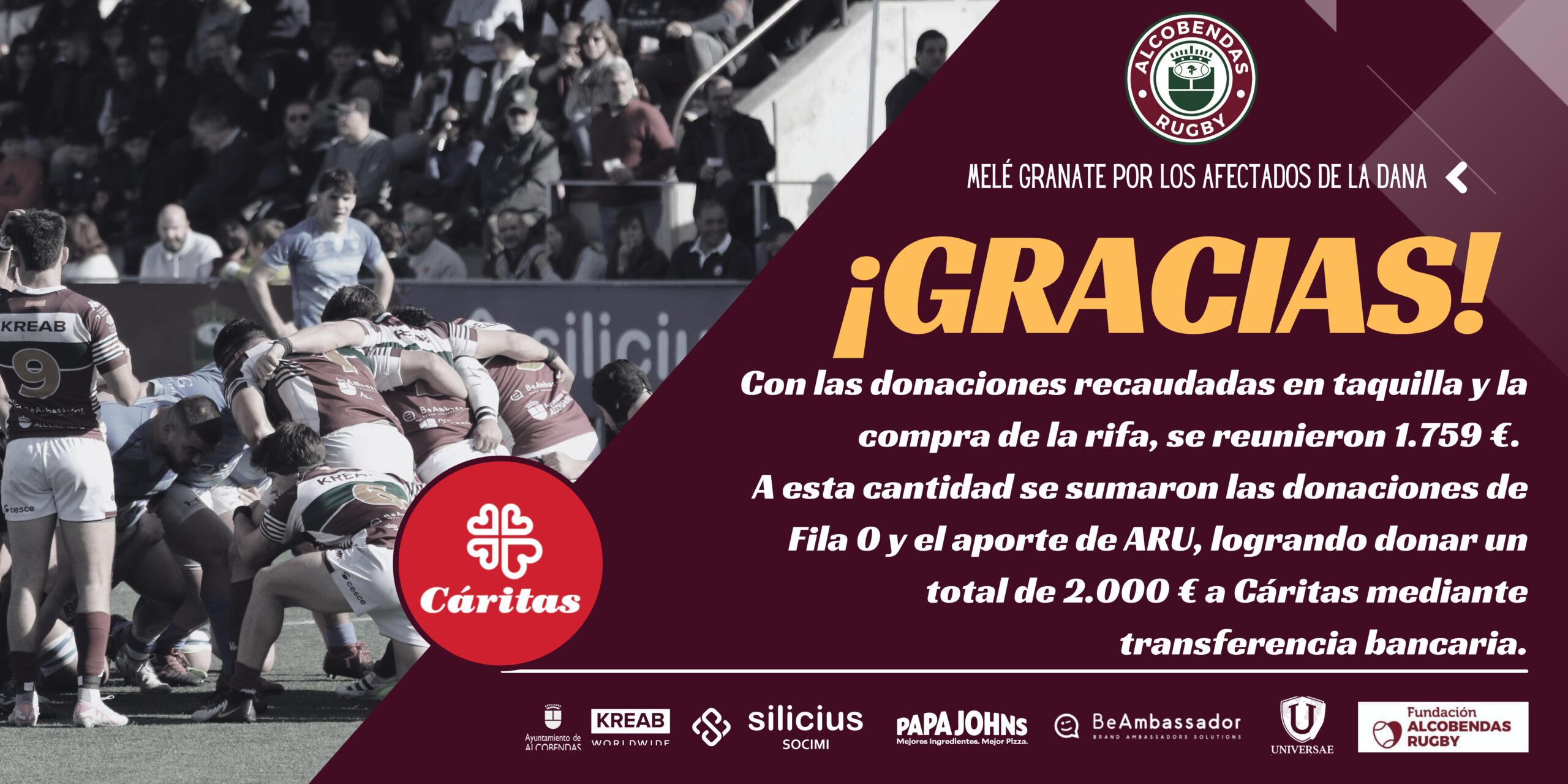 Con las donaciones recaudadas en taquilla y la compra de la rifa, se reunieron 1.759 €. A esta cantidad se sumaron las donaciones de Fila 0 y el aporte de ARU, logrando donar un total de 2.000 € a Cáritas mediante transferencia bancaria.